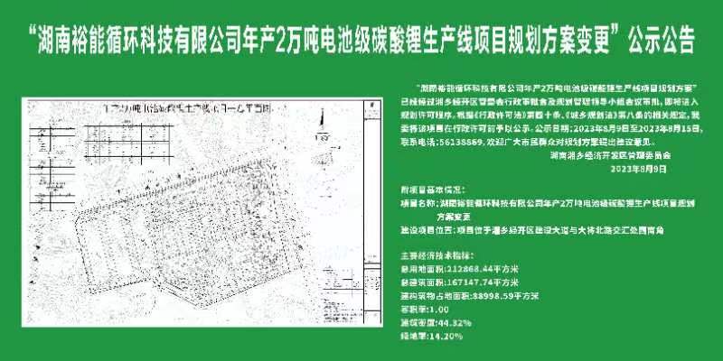 湖南裕能循環(huán)科技有限公司年產(chǎn)2萬噸電池級碳酸鋰生產(chǎn)線項目規(guī)劃方案變更” 公示公告