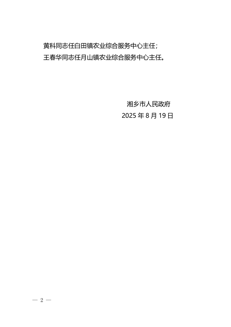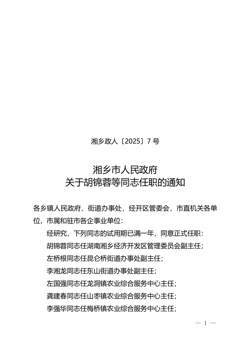 湘鄉政人〔2025〕7號 湘鄉市人民政府 關于胡錦蓉等同志任職的通知