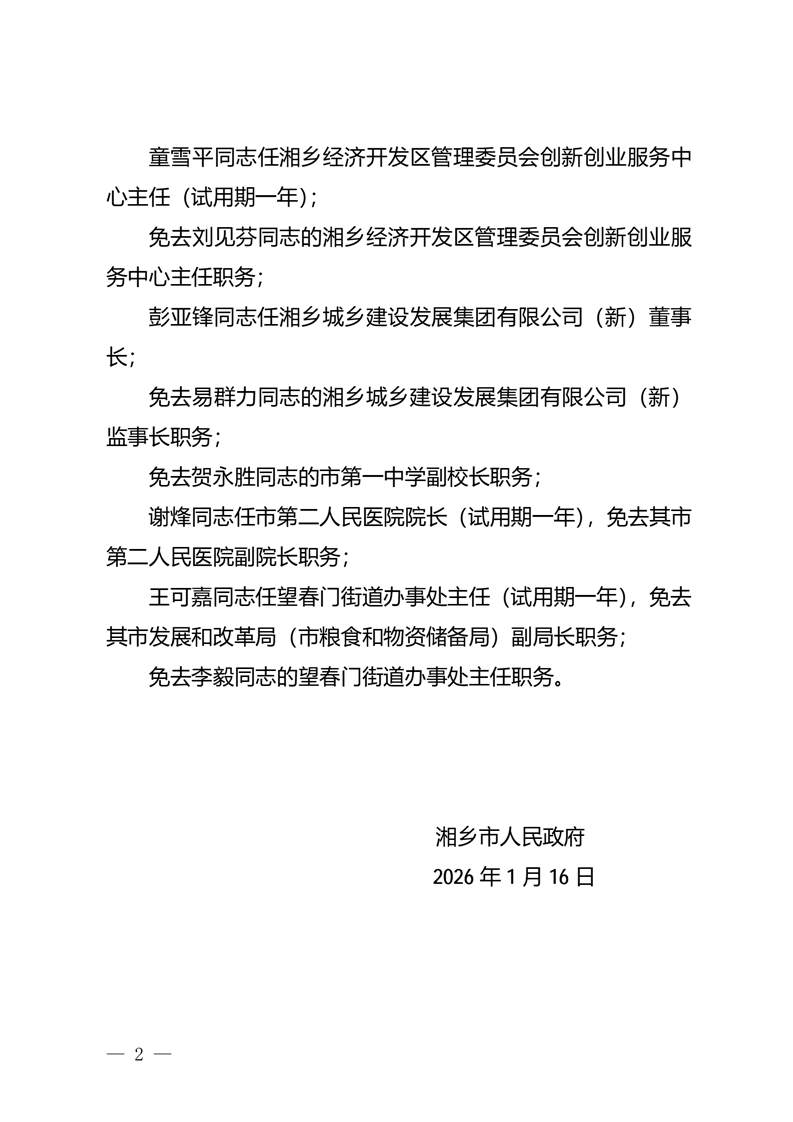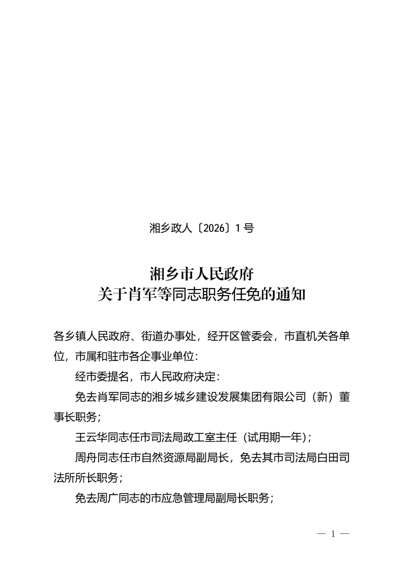 湘鄉政人〔2026〕1號湘鄉市人民政府 關于肖軍等同志職務任免的通知