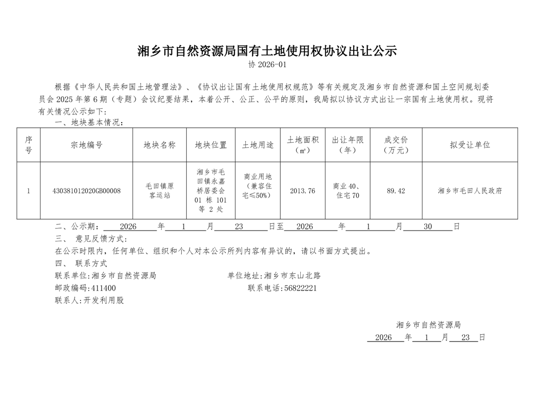 湘鄉(xiāng)市自然資源局國有土地使用權(quán)協(xié)議出讓公示 協(xié)2026-01