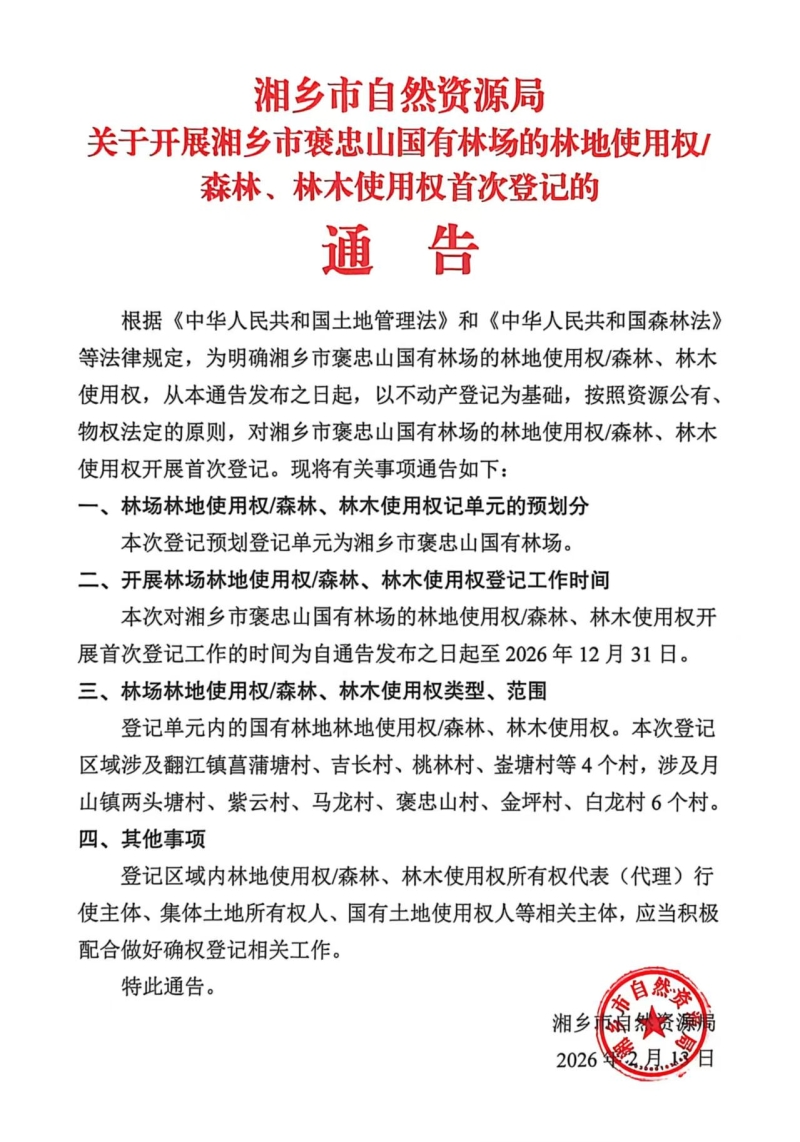 湘鄉(xiāng)市自然資源局關(guān)于開展湘鄉(xiāng)市褒忠山國有林場的林地使用權(quán)/森林、林木使用權(quán)首次登記的通告