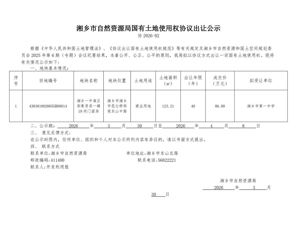 湘鄉市自然資源局國有土地使用權協議出讓公示