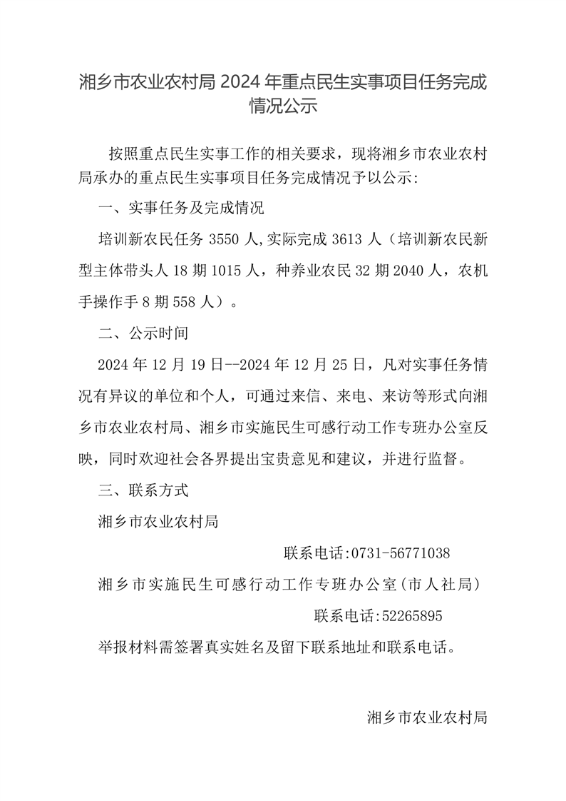 湘鄉市農業農村局2024年重點民生實事項目任務完成情況公示
