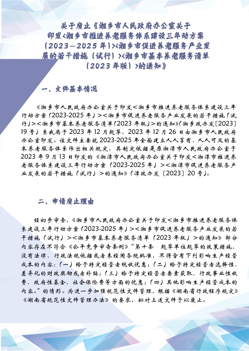 【政策圖解】湘鄉市人民政府 關于廢止《湘鄉市人民政府辦公室關于印發 湘鄉市推進養老服務體系建設三年行動 方案(2023-2025年)湘鄉市促進養老服務產業發展的若干措施(試行)湘鄉市基本 養老服務清單(2023年版)的通知》和 《湘鄉市人民政府