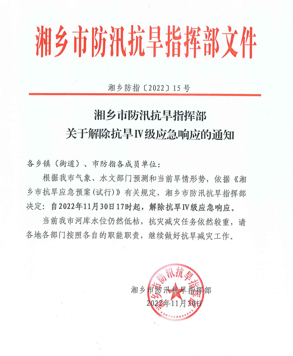 湘鄉(xiāng)市防汛抗旱指揮部關(guān)于解除抗旱IV級應(yīng)急響應(yīng)的通知