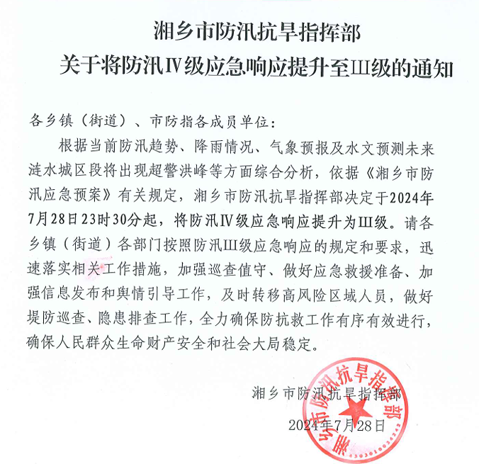 湘鄉市防汛抗旱指揮部關于將防汛Ⅳ級應急響應提升至Ⅲ級的通知