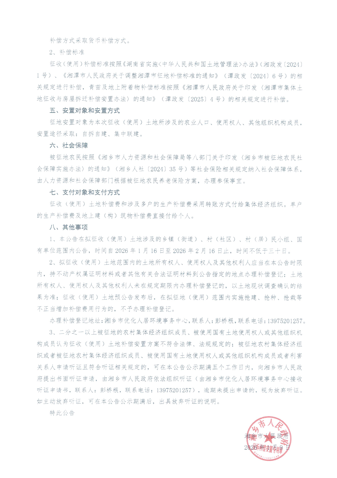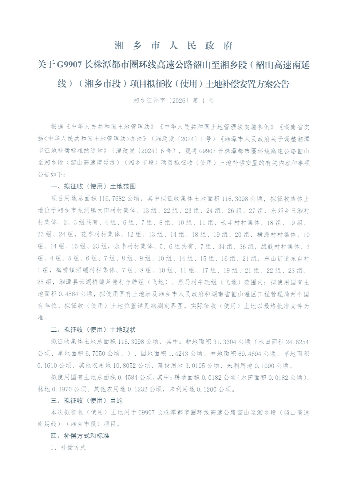 湘鄉市人民政府關于G9907長株潭都市圈環線高速公路韶山至湘鄉段(韶山高速南延線)(湘鄉市段)項目擬征收(使用)土地補償安置方案公告 湘鄉征補字〔2026〕第1號
