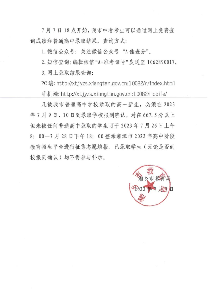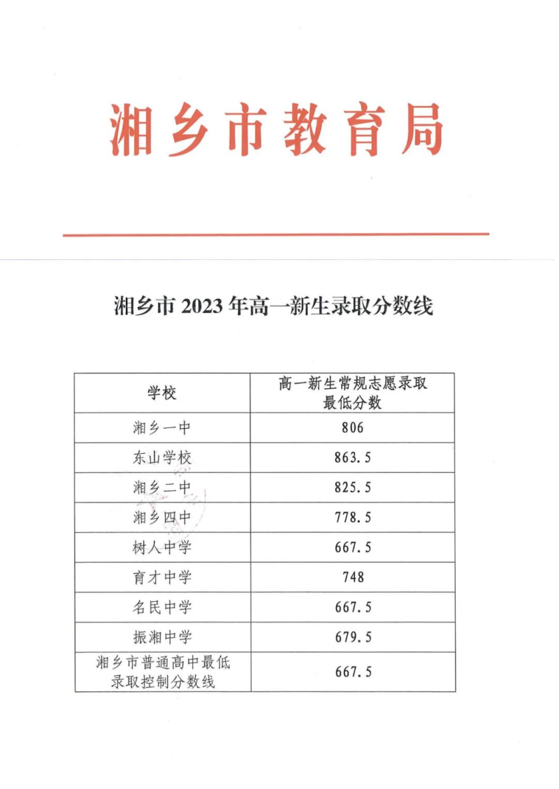湘鄉市2023年高一新生錄取分數線