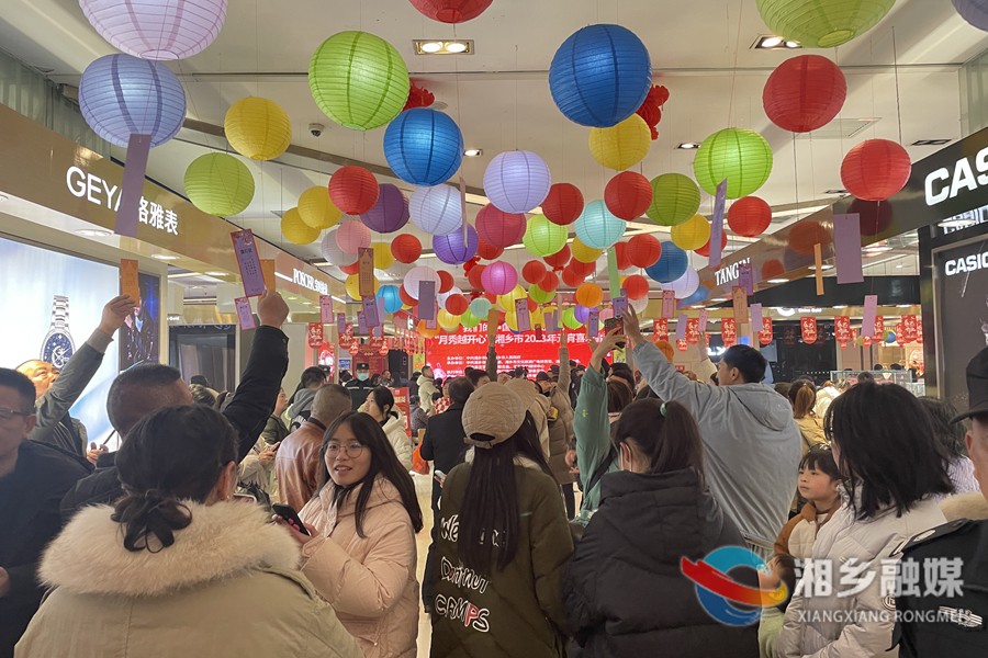 與此同時,元宵節(jié)的重頭戲猜燈謎領(lǐng)獎活動也在火熱進行。“元宵燈火已闌珊,打一謙辭禮貌用語。”“元宵同返家,打一成語。”“綜合門市,猜一字。”……五顏六色的彩紙上寫著各式各樣的燈謎,懸掛在彩色燈籠上,市民猜出燈謎即可將彩紙摘下?lián)Q取獎品。市民三五成群,相互配合,200個燈謎很快被大家悉數(shù)揭開。“我第一次參加猜燈謎慶元宵活動,覺得特別有趣,還領(lǐng)到了一份獎品。”市民王天怡開心地說。