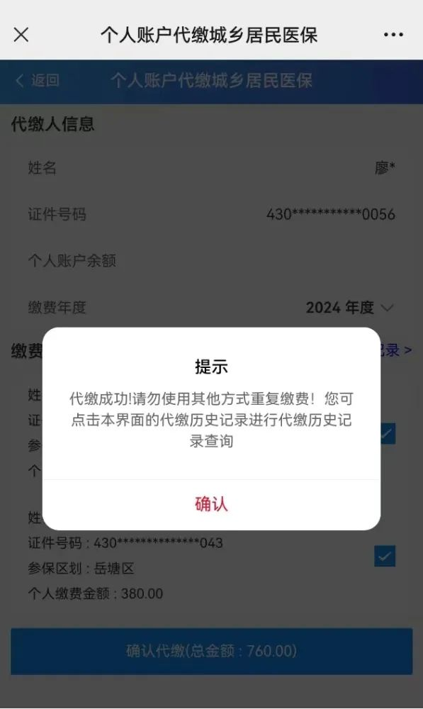第四步:選擇繳費年度“2024年度”以及參保地區-點擊“確認代繳”-代繳成功。