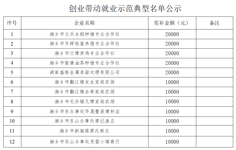 根據《開展創業帶動就業示范典型評選獎補工作實施方案》(湘鄉人社發[2022]23號)文件精神,湘鄉市2024年創業帶動就業示范典型評選經創業主體申報,鄉鎮街道推薦,相關職能部門實地考察和審核,以下12家單位符合評選獎補條件。