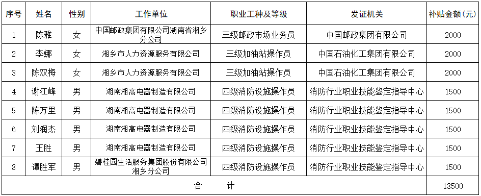 湘鄉市2023年9月失業保險技能提升補貼公示表