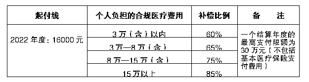 參保人員一個結算年度內個人負擔的合規醫療費用累計超16000元以上的部分按比例補償。