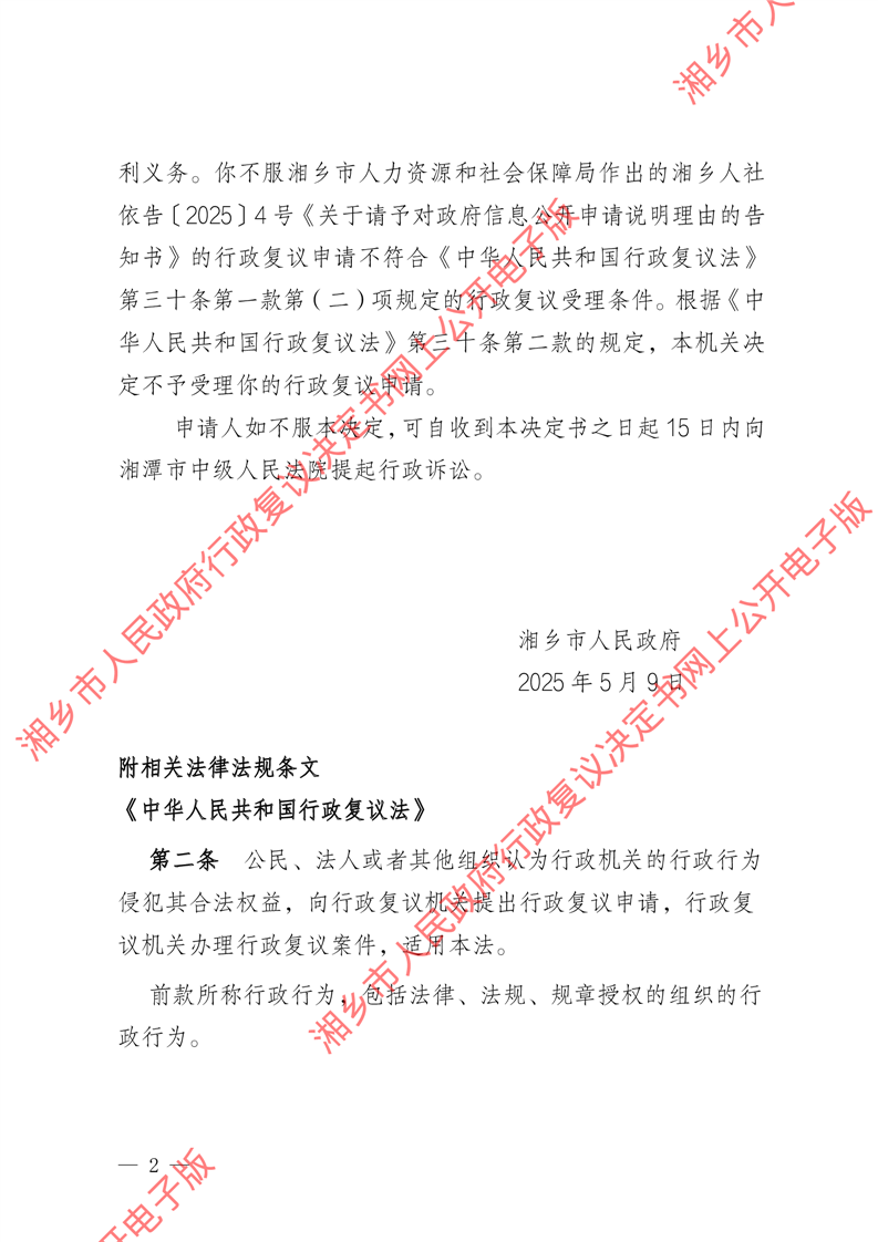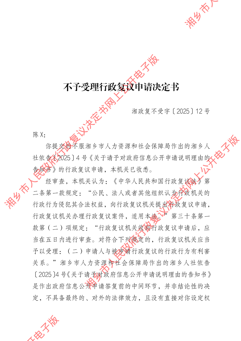 湘政復(fù)不受字〔2025〕12號《不予受理行政復(fù)議申請決定書》