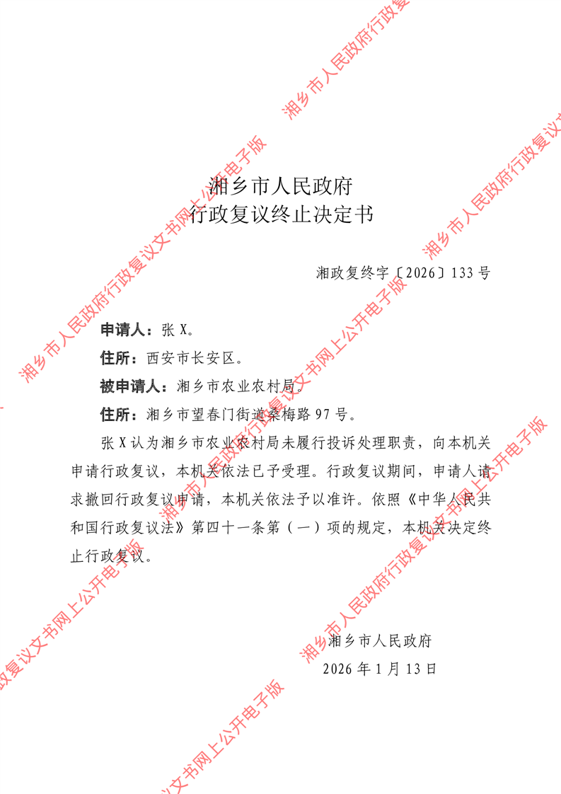 湘政復終字〔2026〕133號《行政復議終止決定書》