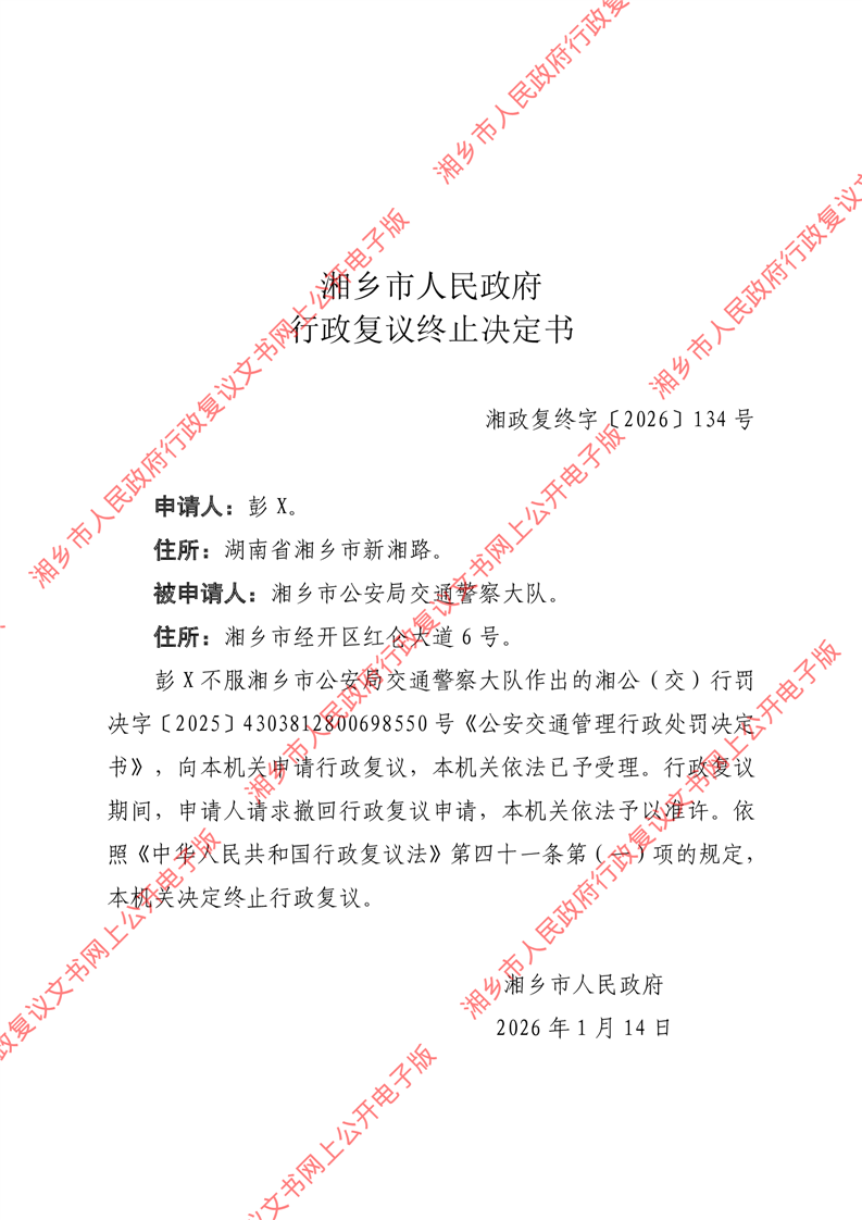 湘政復終字〔2026〕134號《行政復議終止決定書》