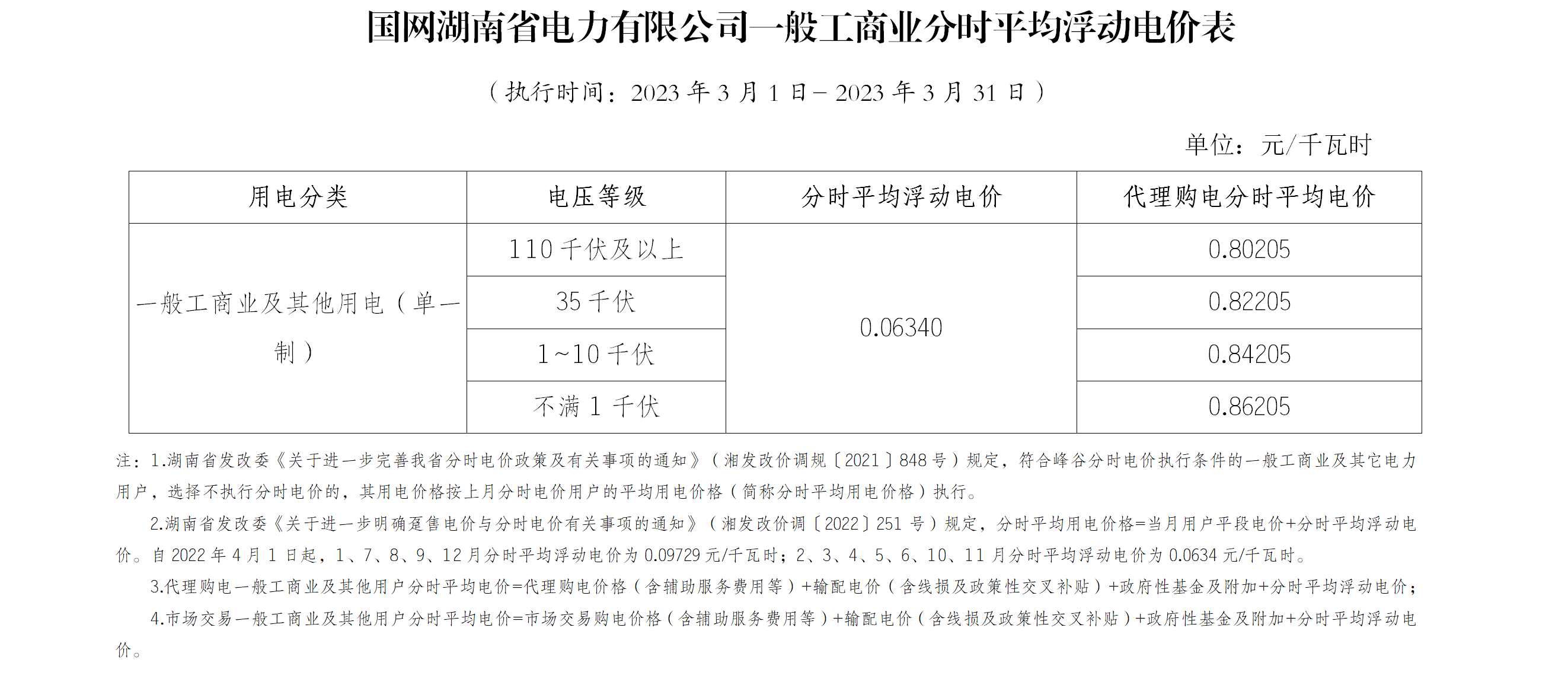 2023年3月一般工商業分時平均浮動電價公告