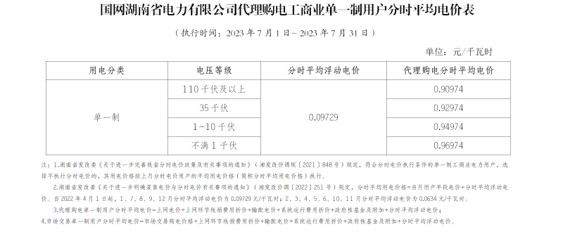2023年7月代理購電工商業(yè)單一制用戶分時平均電價表