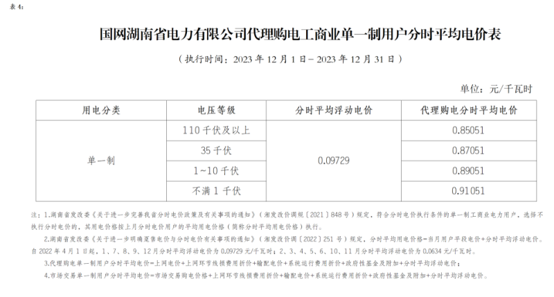2023年12月代理購電工商業單一制用戶分時平均電價表