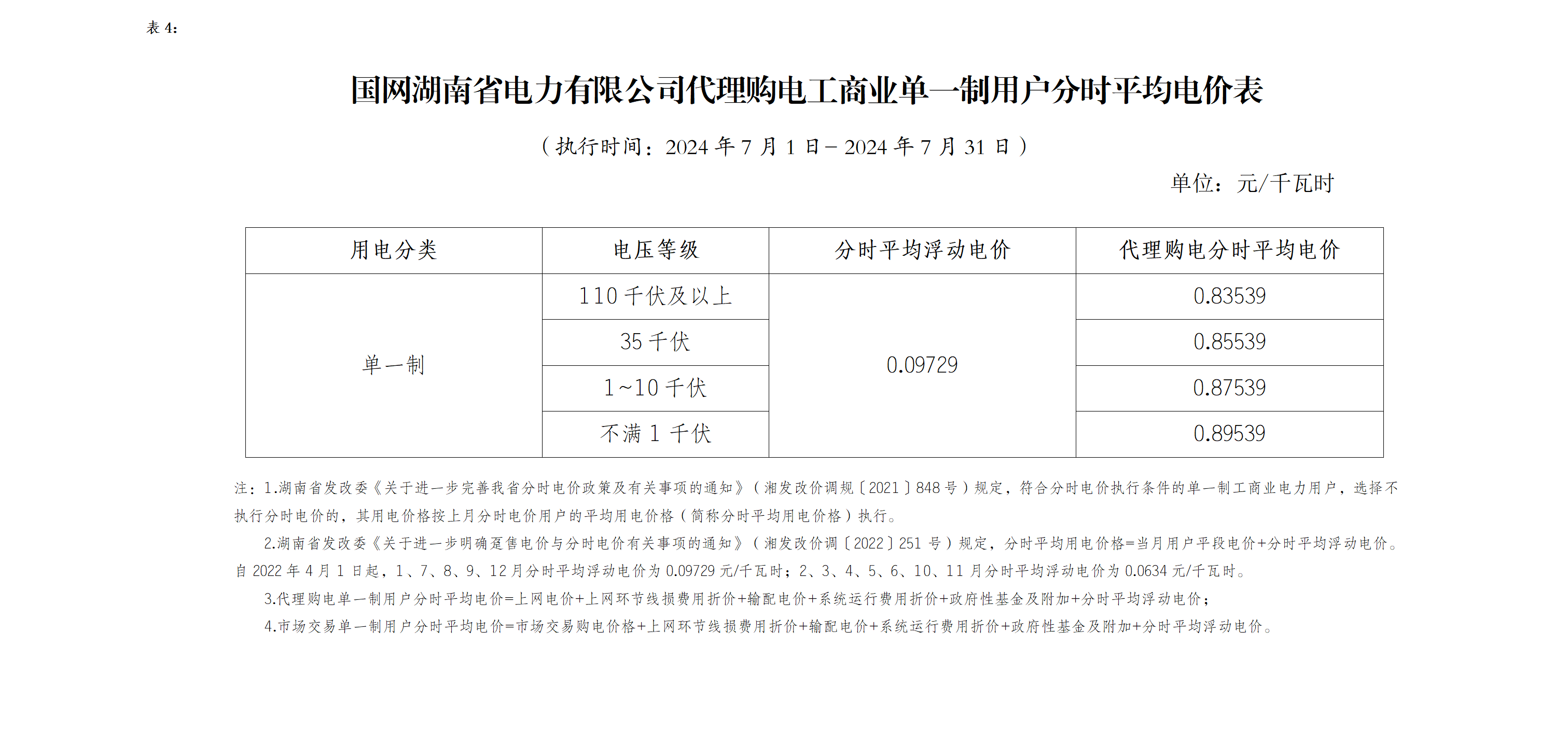 2024年7月代理購電工商業單一制用戶分時平均電價表