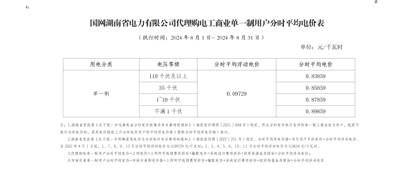 2024年8月代理購電工商業單一制用戶分時平均電價表