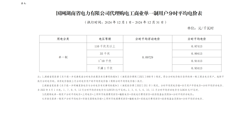 2024年12月代理購電工商業(yè)單一制用戶分時(shí)平均電價(jià)表