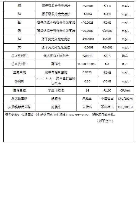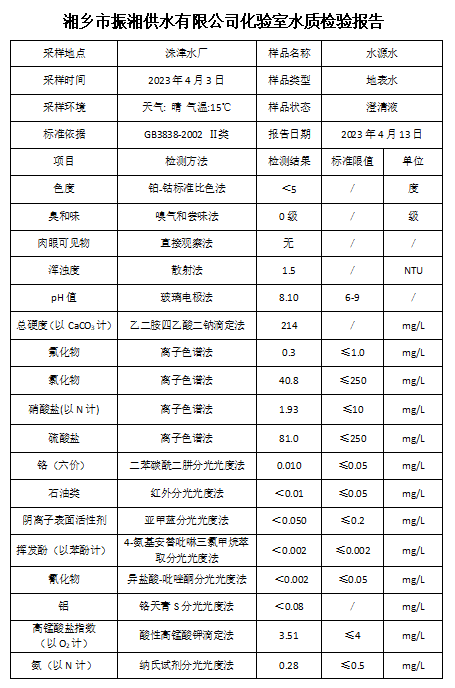 2023年4月湘鄉市振湘供水有限公司化驗室水質檢驗報告