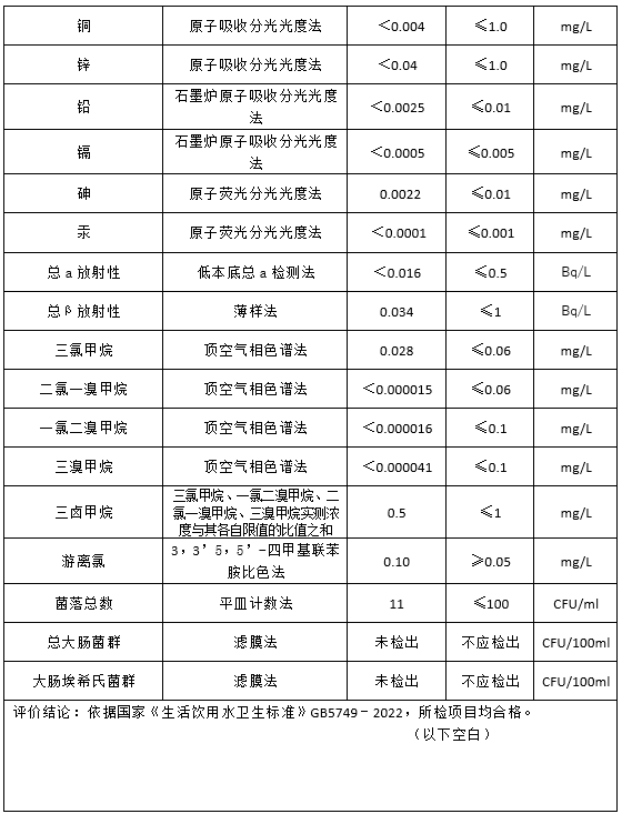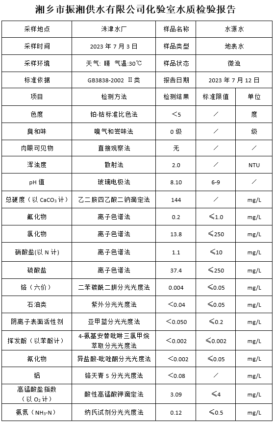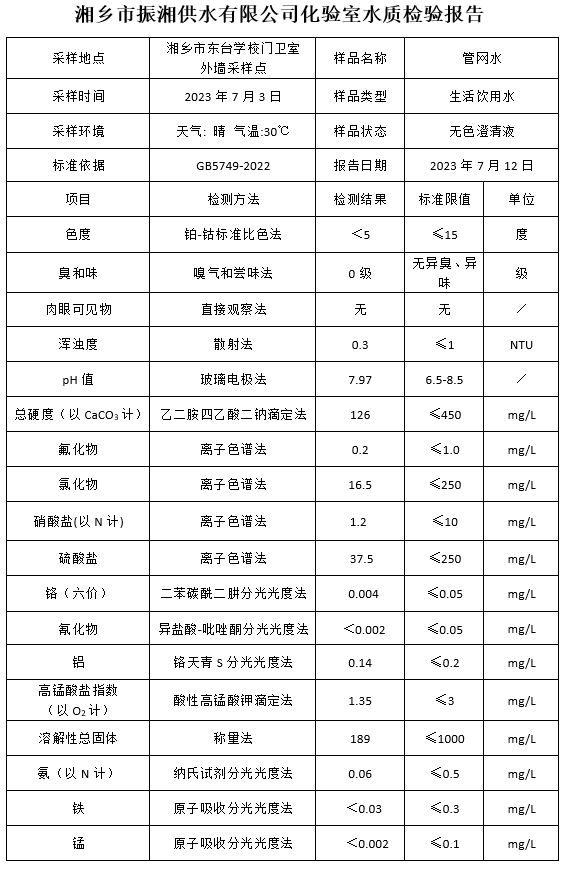 2023年7月湘鄉市振湘供水有限公司化驗室水質檢驗報告