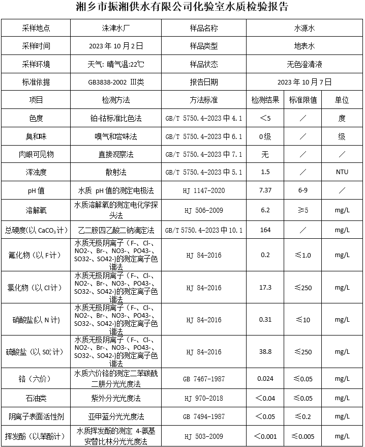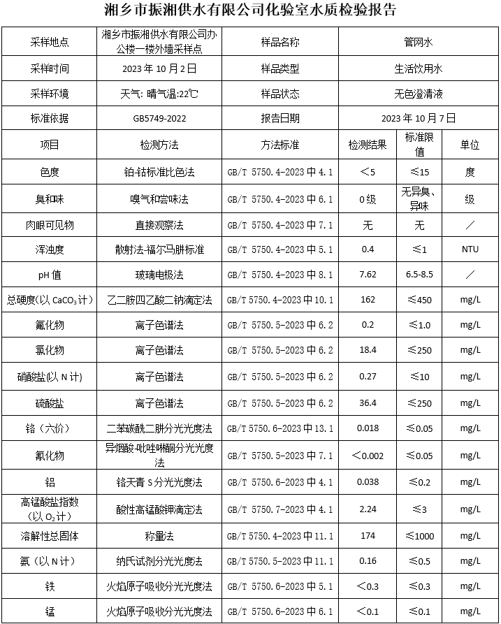 2023年10月湘鄉(xiāng)市振湘供水有限公司化驗(yàn)室水質(zhì)檢驗(yàn)報(bào)告