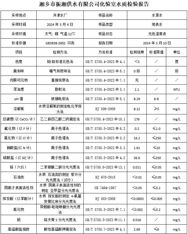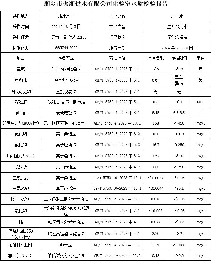 2024年3月湘鄉(xiāng)市振湘供水有限公司化驗室水質(zhì)檢驗報告