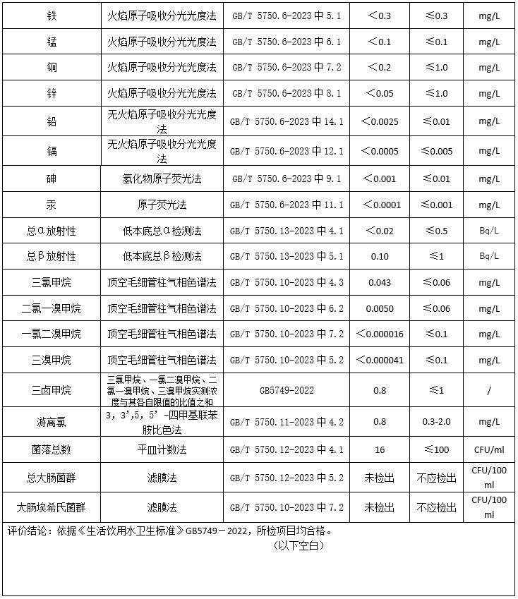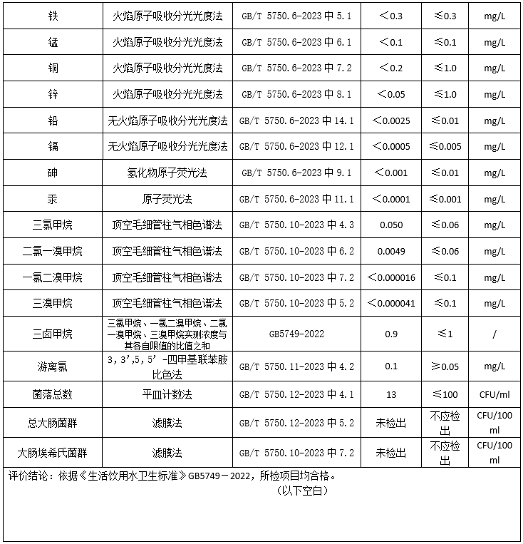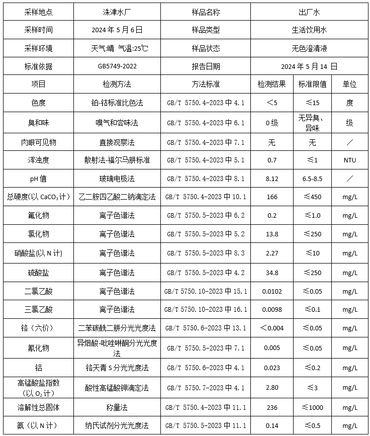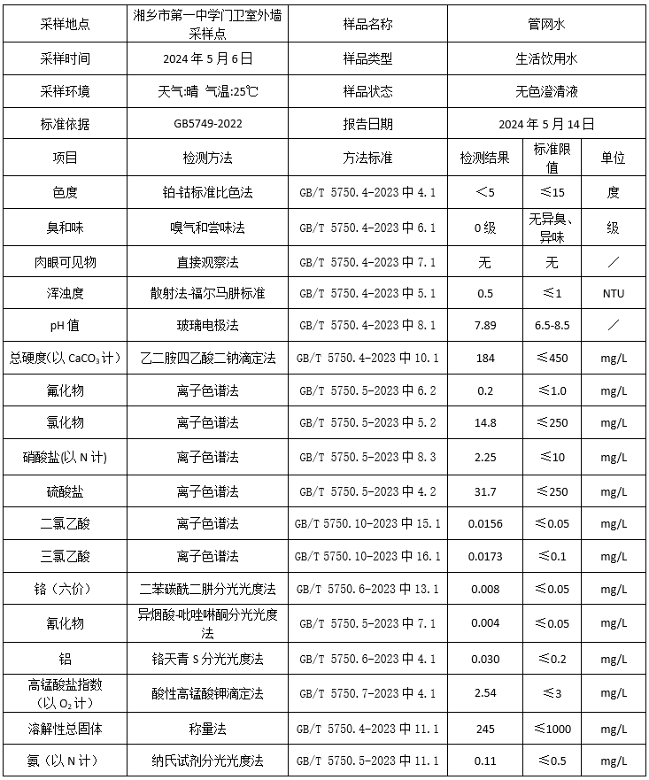 2024年5月湘鄉市振湘供水有限公司化驗室水質檢驗報告