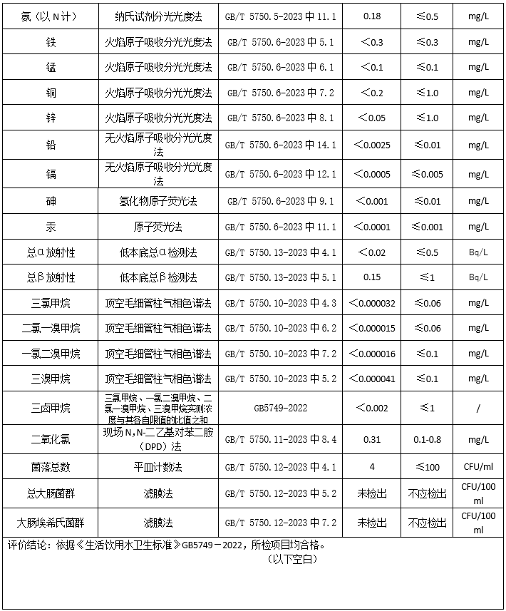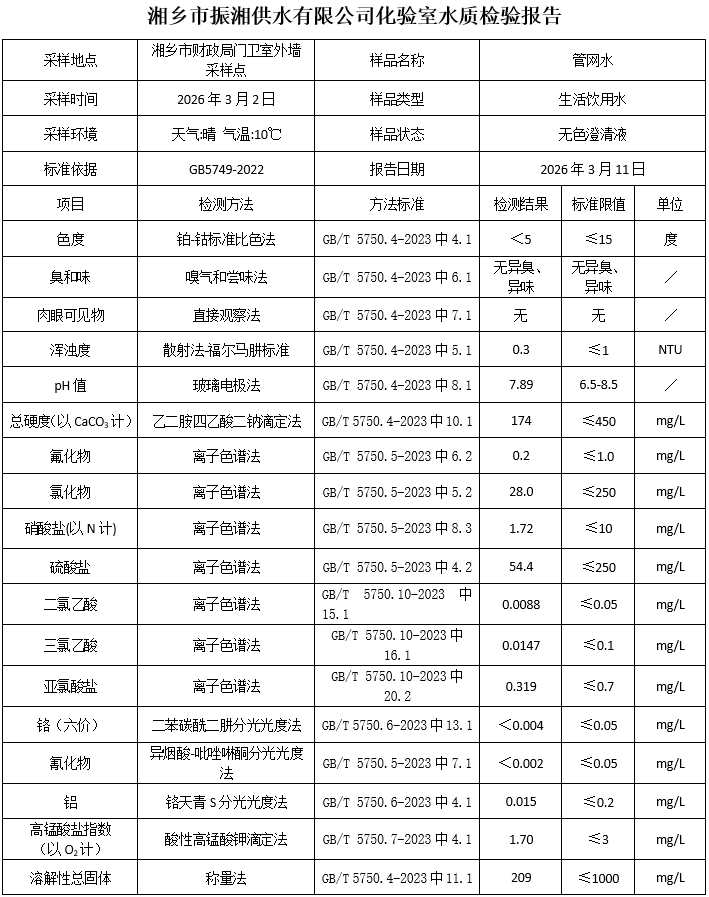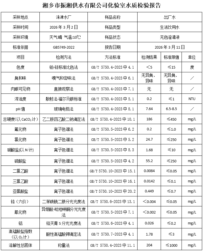 2026年3月湘鄉市振湘供水有限公司化驗室水質檢驗報告
