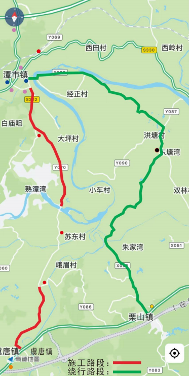 二、交通管制路段及措施:S222線湘鄉潭市鎮(起點潭市鎮潭臺村一終點虞唐鎮新屋沖)樁號K38+968K41+949一K42+214K45+843一K49+468K51+596實行全幅封閉施工,封閉施工期間中重型貨車請提前繞行至G320線,051、052縣道通行。