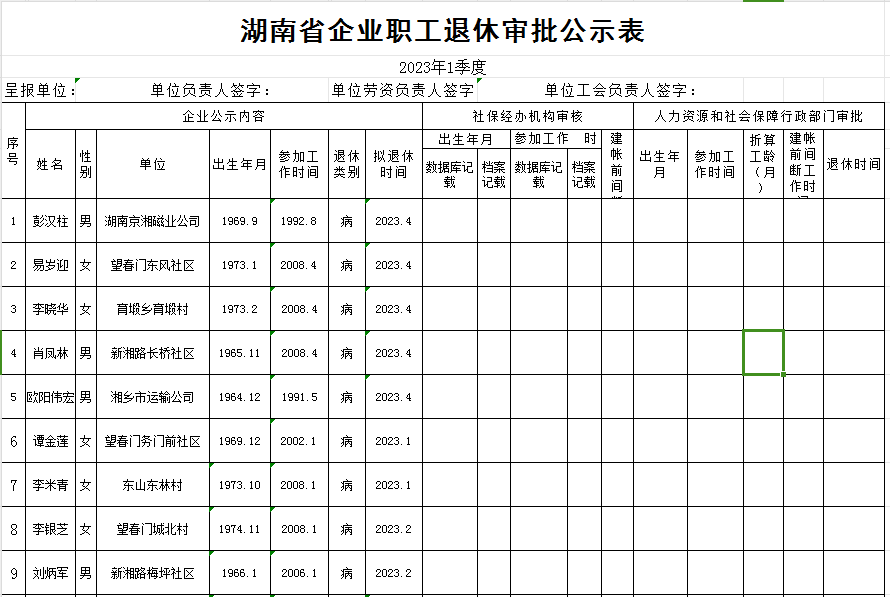 湘鄉市2023年1季度因病完全喪失勞動能力提前退休擬通過人員公示