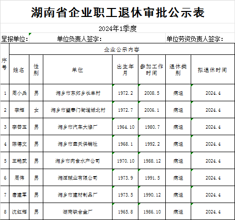 湘鄉市2024因病完全喪失勞動能力提前退休擬通過人員公示