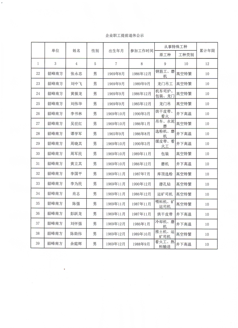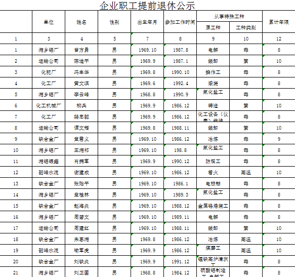 現(xiàn)將擬辦理(特殊工種/非因工傷殘或因病完全喪失勞動能力)提前退休人員基本情況予以公示,公示時間5個工作日(2024年10月25日至2024年10月31日)。如有異議,請在公示期內(nèi)向湘鄉(xiāng)市人力資源和社會保障局(舉報電話:0731-52265582)反映。