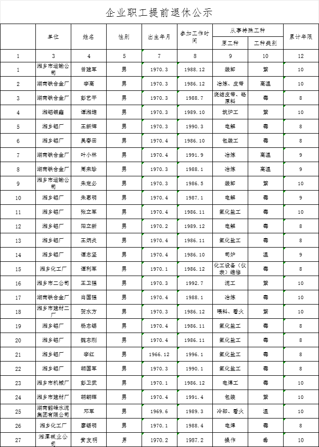 現(xiàn)將擬辦理特殊工種提前退休人員基本情況予以公示,公示時(shí)間5個(gè)工作日202556日至2025512日)。如有異議,請?jiān)诠酒趦?nèi)向湘鄉(xiāng)市人力資源和社會(huì)保障局(舉報(bào)電話:0731-52265582)反映。