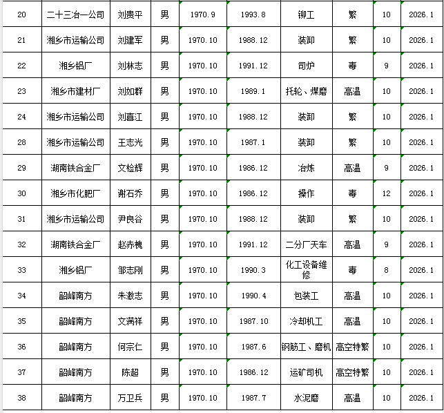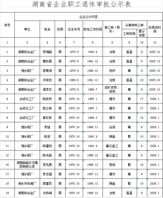 現將擬辦理特殊工種提前退休人員基本情況予以公示,公示時間5個工作日2026120日至2026126日)。如有異議,請在公示期內向湘鄉市人力資源和社會保障局(舉報電話:0731-52265582)反映。