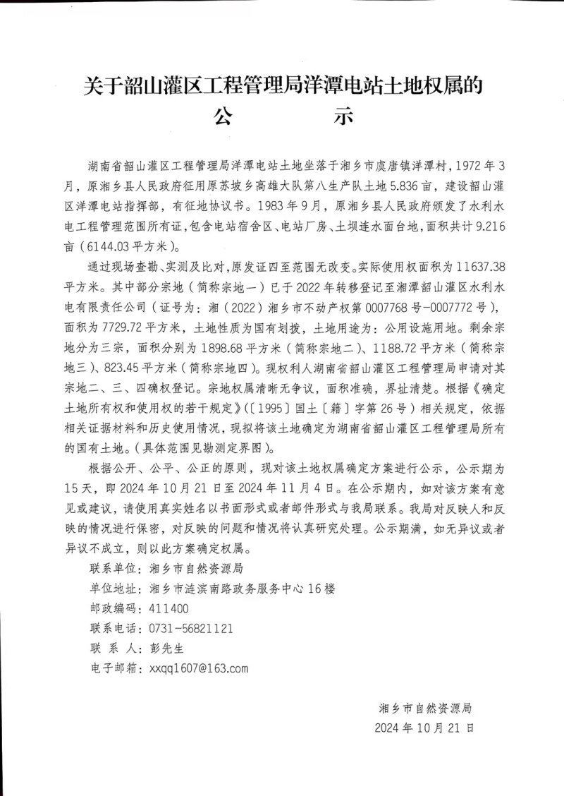 關于韶山灌區工程管理局洋潭電站土地權屬的公示