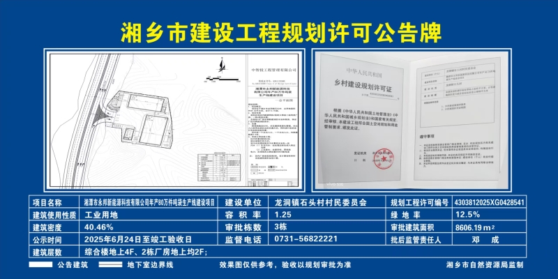 湘鄉市建設工程規劃許可公告牌(湘潭市永邦新能源科技有限公司年產80萬件噸袋生產線建設項目)
