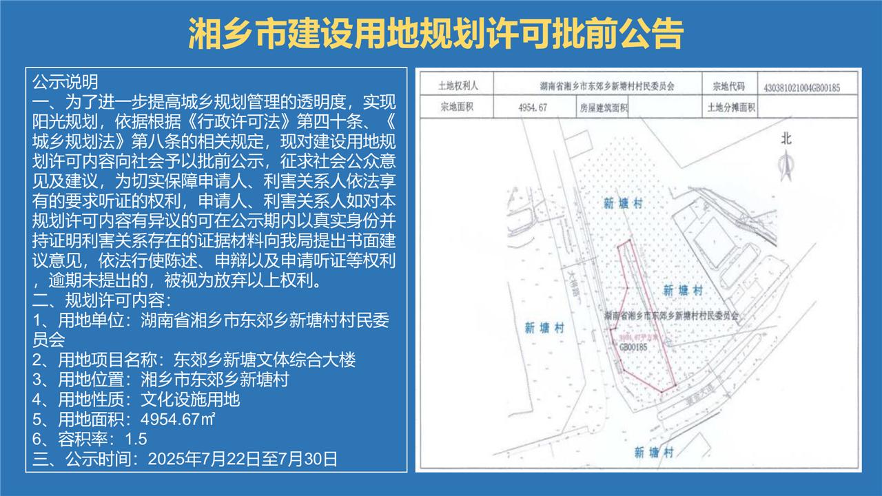 湘鄉(xiāng)市建設(shè)用地規(guī)劃許可批前公告(東郊鄉(xiāng)新塘文體綜合大樓)