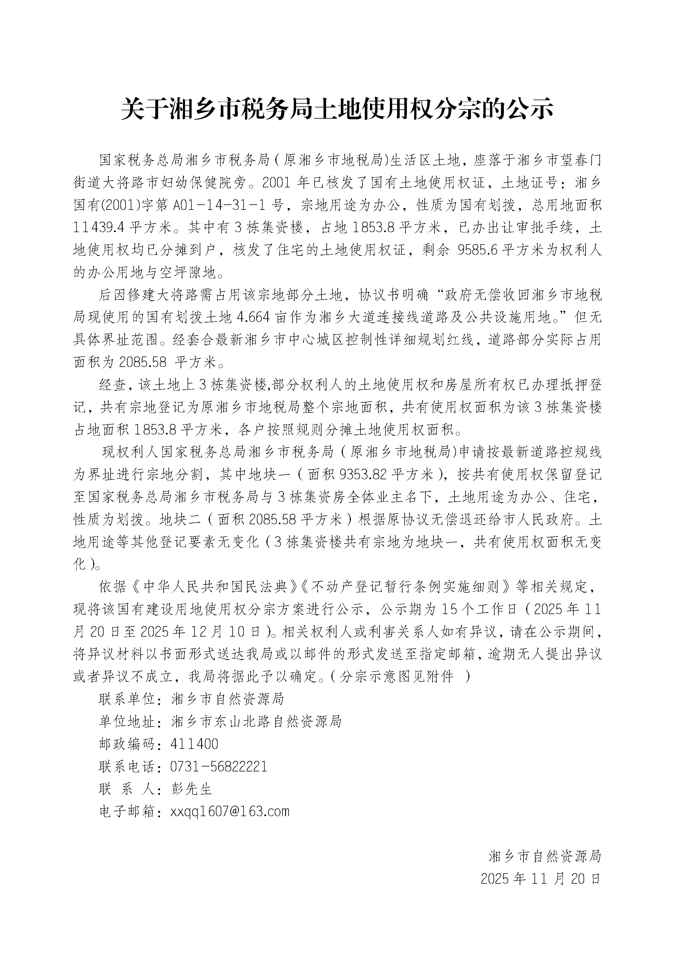 關于湘鄉市稅務局土地使用權分宗的公示