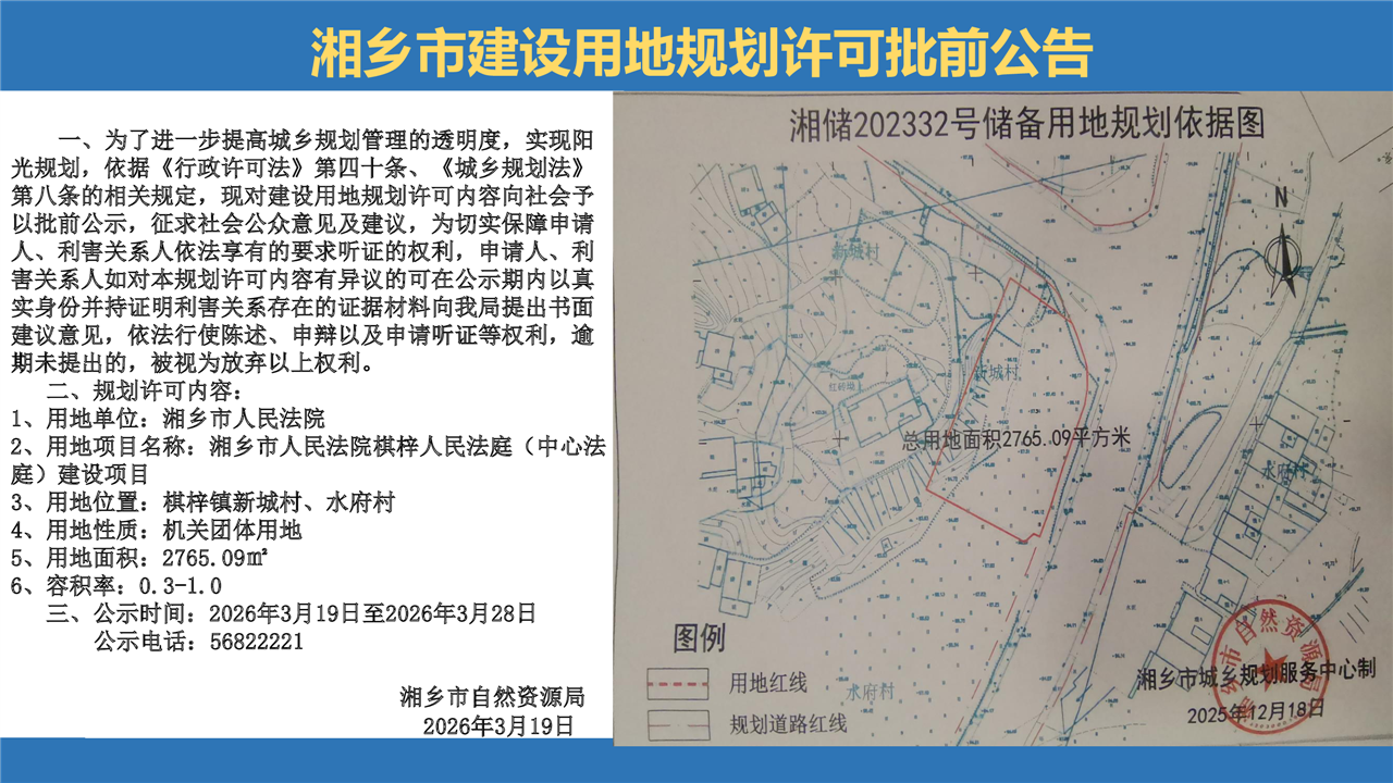 湘鄉市建設用地規劃許可批前公告(湘鄉市人民法院棋梓人民法院(中心法庭))建設項目