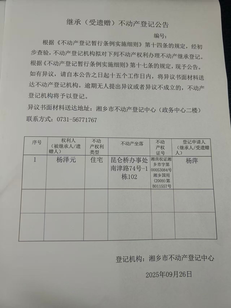 索引號:4303000006/2025-1393953 發布機構:不動產信息公開 發布目錄:不動產登記公告