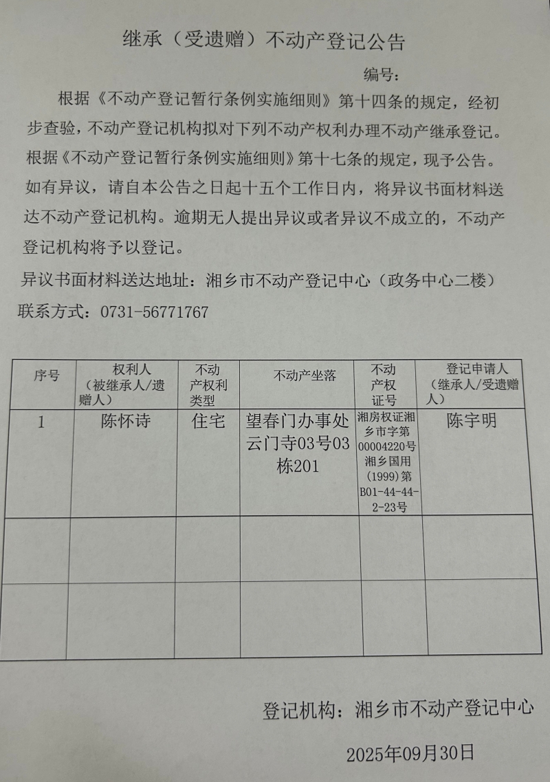 索引號:4303000006/2025-1394688 發(fā)布機(jī)構(gòu):不動產(chǎn)信息公開 發(fā)布目錄:不動產(chǎn)登記公告