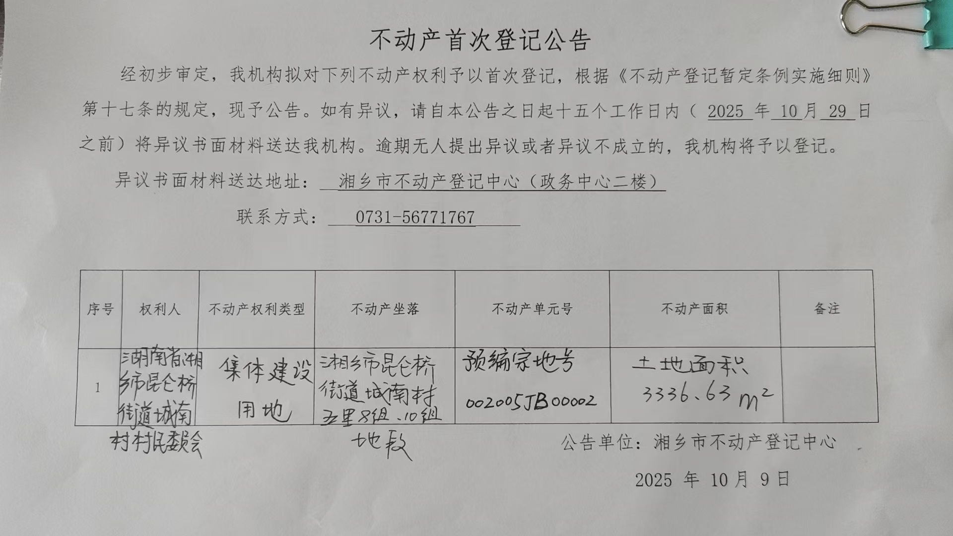索引號:4303000006/2025-1395039 發布機構:不動產信息公開 發布目錄:不動產登記公告
