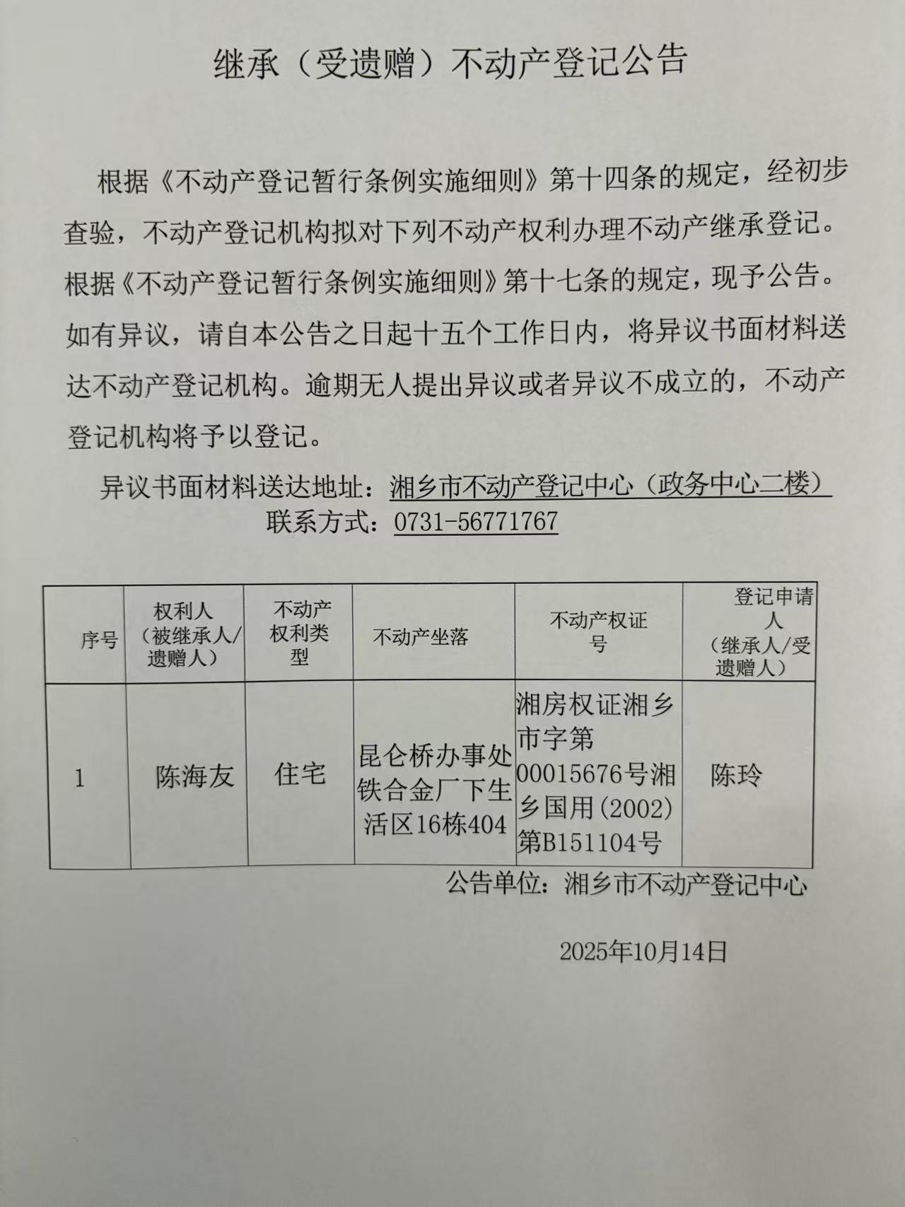 索引號:4303000006/2025-1396106 發布機構:不動產信息公開 發布目錄:不動產登記公告