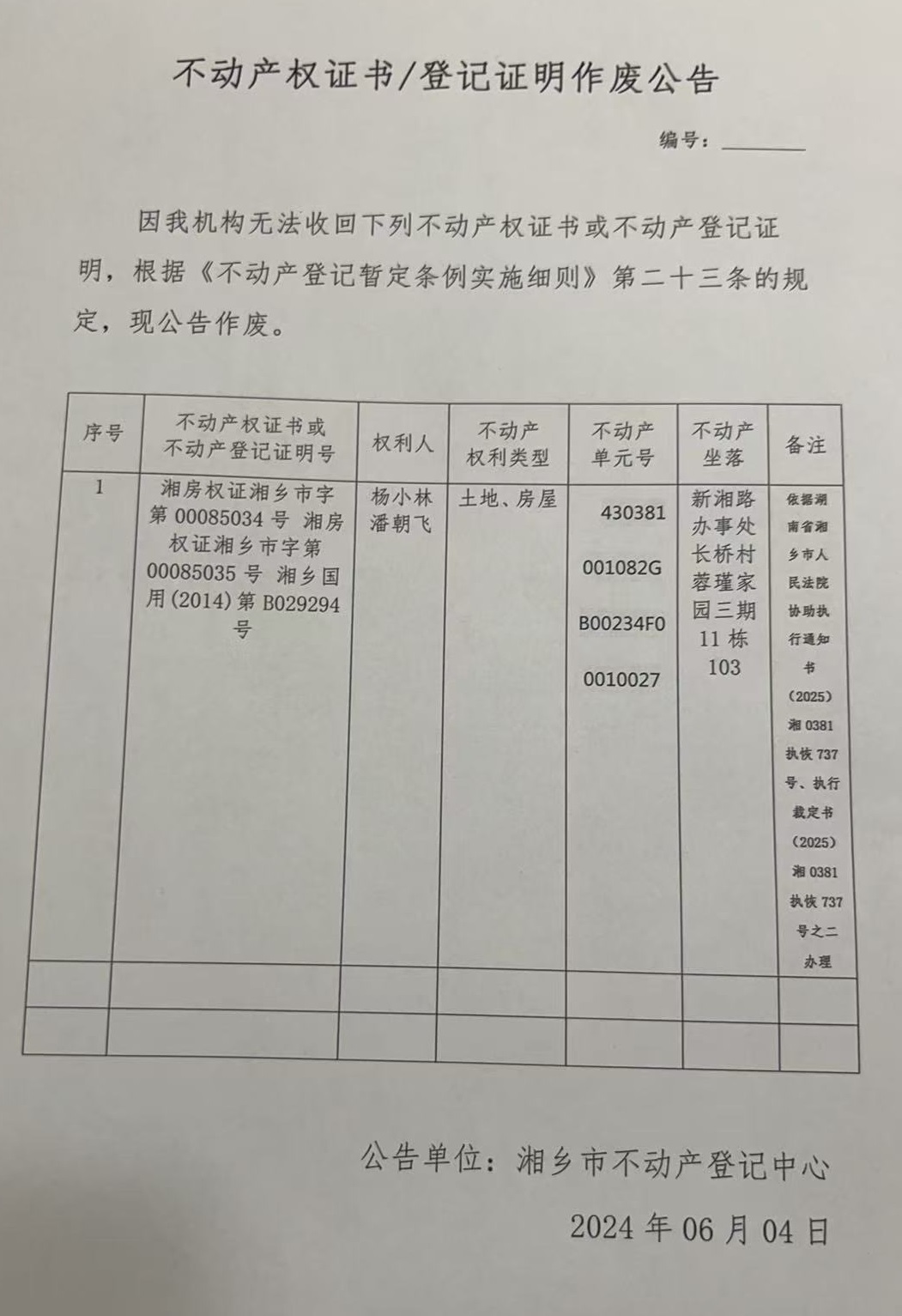 索引號:4303000006/2025-1396392 發布機構:不動產信息公開 發布目錄:不動產登記公告