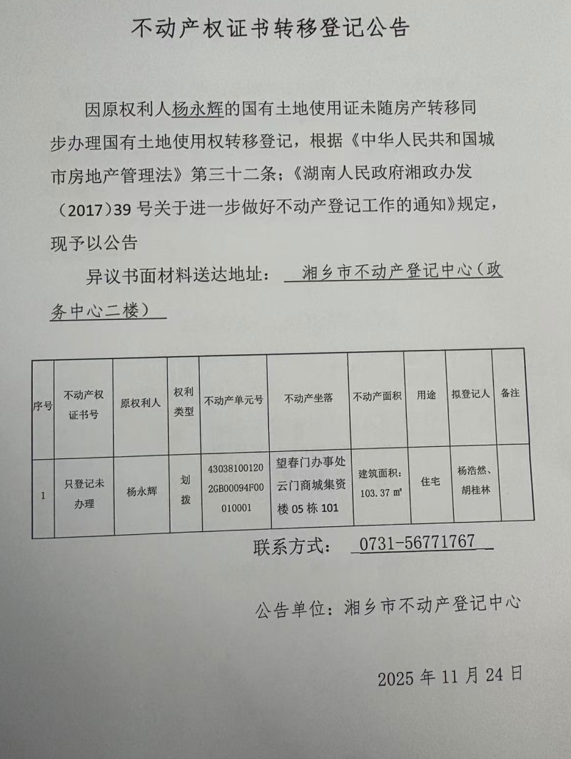 索引號:4303000006/2025-1403289 發布機構:不動產信息公開 發布目錄:不動產登記公告