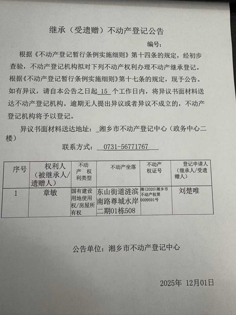 索引號:4303000006/2025-1404117 發布機構:不動產信息公開 發布目錄:不動產登記公告